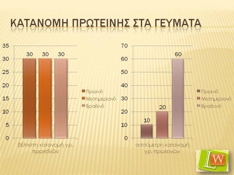 Εικόνα: Κατανομή πρωτεϊνών στα γεύματα. Α) Κατανάλωση 90 γραμμαρίων πρωτεΐνης, τα οποία διανέμονται ομοιόμορφα στα 3 γεύματα. Β) Κατανάλωση 90 γραμμαρίων πρωτεϊνών άνισα κατανεμημένα σε όλη την ημέρα. Η τόνωση των μυών για πρωτεϊνοσύνθεση σε μέγιστο βαθμό κατά τη διάρκεια των γευμάτων στο πρώτο σχήμα είναι πιο πιθανό να παρέχει μεγαλύτερη αναβολική απόκριση πρωτεΐνης σε 24 ώρες από την άνιση κατανομή πρωτεΐνης στο δεύτερο σχήμα (Προσαρμογή από Paddon-Jones & Rassmussen Curr Opin Clin Nutr Metab Care 2009, 12: 86–90)